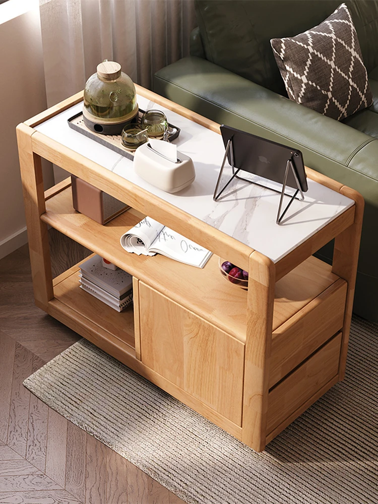 Stylish Solid Wood Movable Rock Slab Side Cabinet - Perfect for Small Spaces! Modern Natural Wood Coffee Table with Wheels, Ideal for Your Living Room and Tea Service.