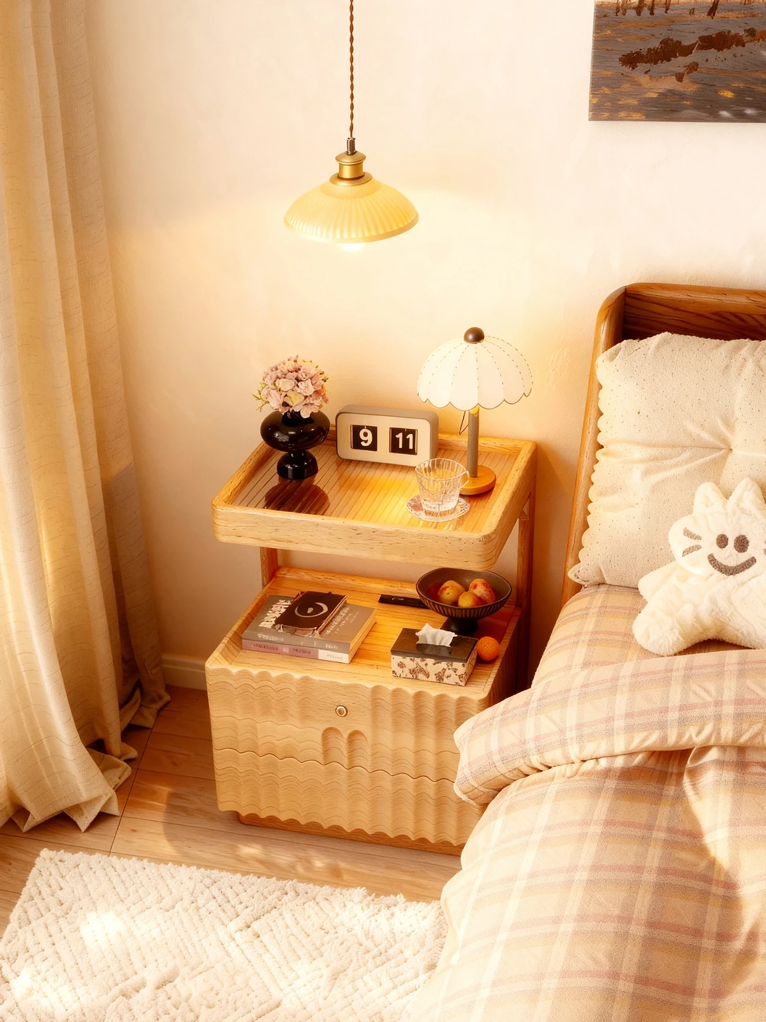 全実木製和風ナイトテーブル、ライト付き収納キャビネット、コンパクトサイズでおしゃれなデザイン、家族の寝室にぴったり、鍵付きで安心の収納スペース!