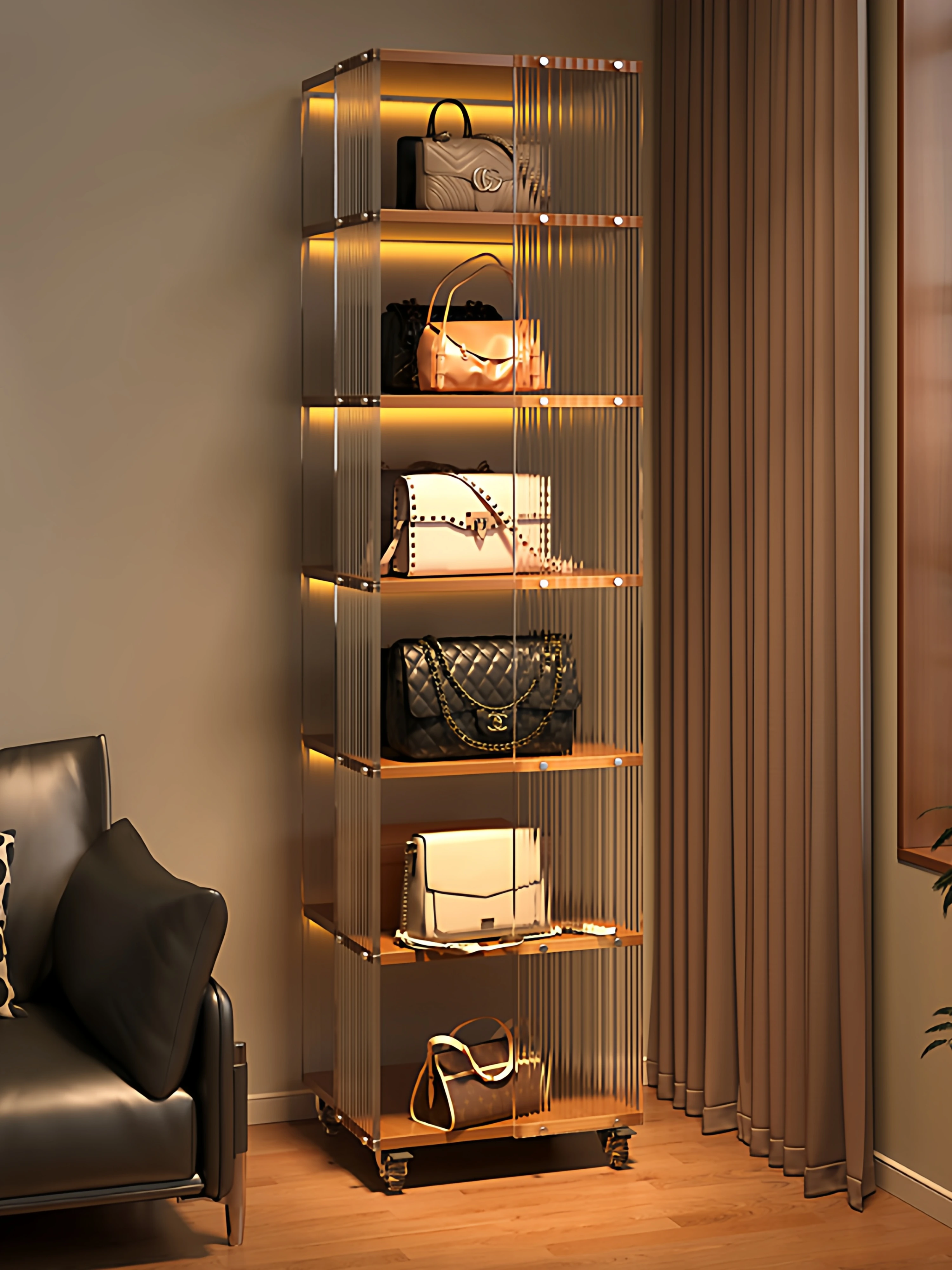 アクリルバッグ収納ラック|リビングに最適な多層ディスプレイ棚|回転式ブックシェルフ|フロアスタンド型書棚|家庭用にぴったり!おしゃれで実用的な収納ソリューション!