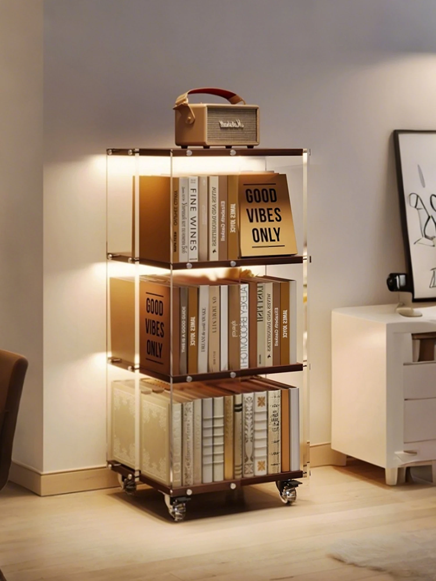 Stylish Small Acrylic Display Rack - Multi-Layer Storage Shelf for Home, Elegant Corner Bookcase, Mobile Floor Stand for Living Room Organization.