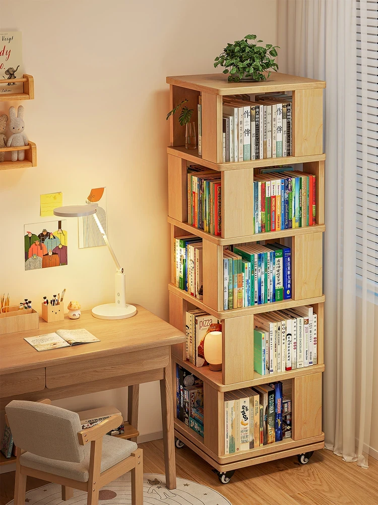 Solid Wood 360° Rotating Bookshelf - Mobile Floor Storage Rack for Desk Side, Wall-Mounted Corner Cabinet, Square Narrow Bookcase