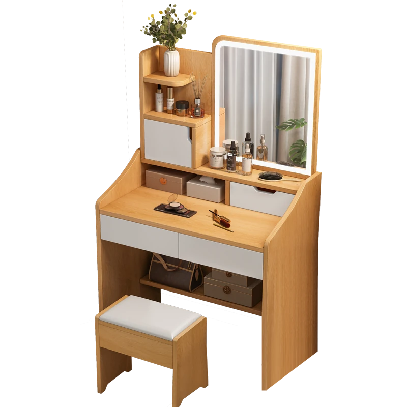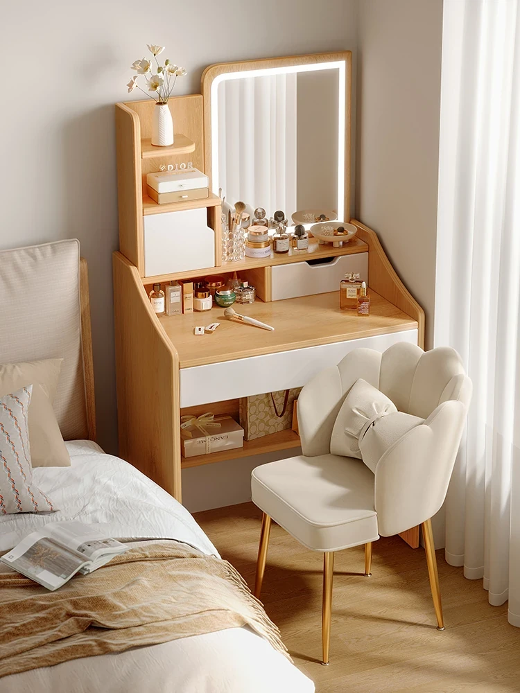 2025年新款!小型寝室用ミニマリスト化妆台、60cm幅のコンパクトなベッドサイドキャビネット一体型。シンプルでスタイリッシュ、狭い空間でもおしゃれに使える!