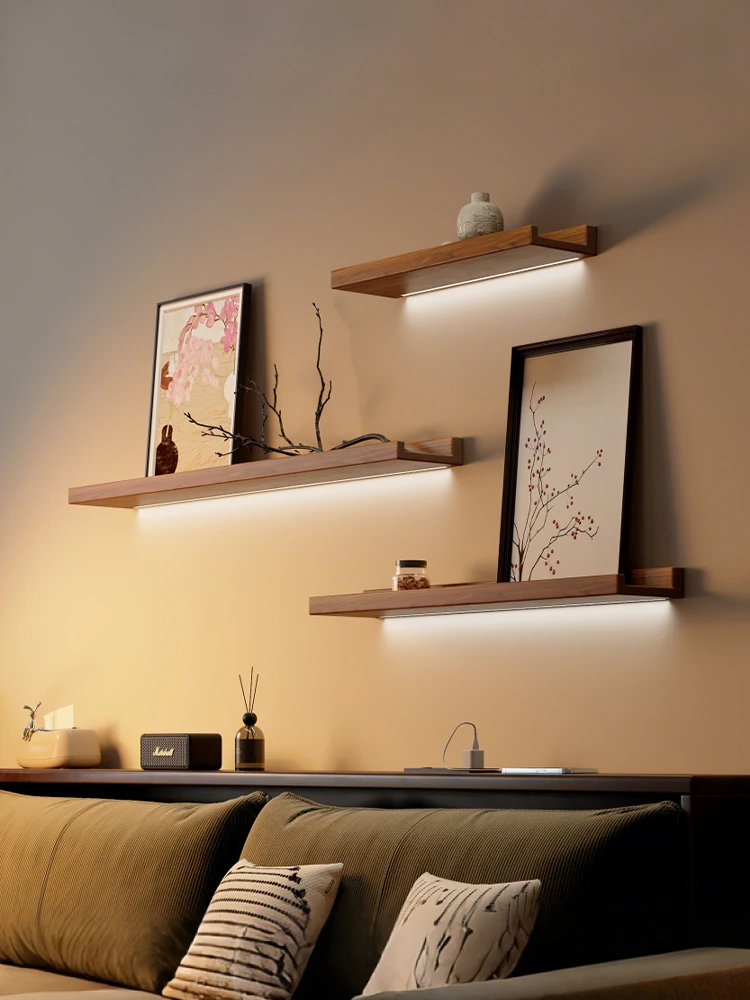 ウォールマウント無孔設置、くるみ色の無垢材シェルフ - リビングルームに最適な一字型木製ディスプレイラックで、おしゃれな壁面装飾を実現!