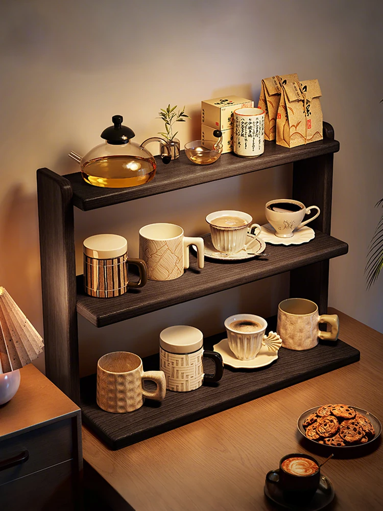 レトロな無垢材コップスタンド - デスク上の美しい収納ラック!マグカップやコーヒーカップ、ティーセットをスタイリッシュにディスプレイ。小型で場所を取らず、インテリアにもぴったり。あなたの生活空間を華やかに彩ります!